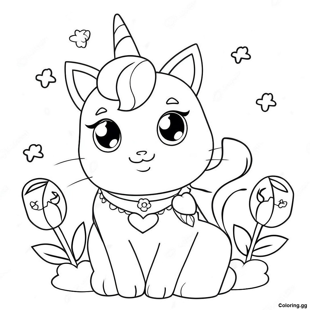Hlaða niður prentvænu PDF af Sæt Einhyrningakatta Með Blómum Litabók